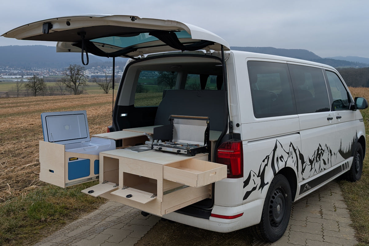 Für Einkäufe ist Platz in der Kühlbox sowie für Euroboxen oder Getränkekisten und zum Campen kann einfach eine Küche aufgesteckt werden.