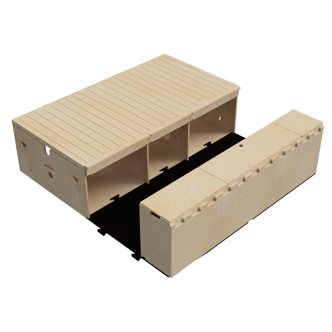 Unter dem Bett können verschiedene Boxmodule verstaut werden. Diese werden wärend der Fahrt gegen verutschen gesichert.