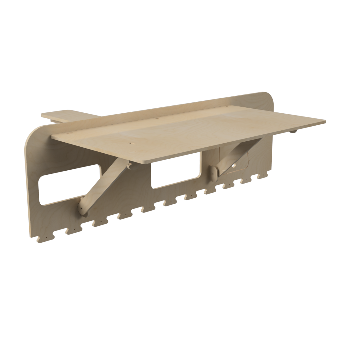Der Klapptisch wird mit dem Seitenschrank oder mit der Lattenrostauflage auf der Beifahrerseite verschraubt. Zusätzlich wird die Seitenwand in dem Fach für das Pannenset befestigt. Hierzu muss die Styroporhalterung des Pannensets entfernt werden.